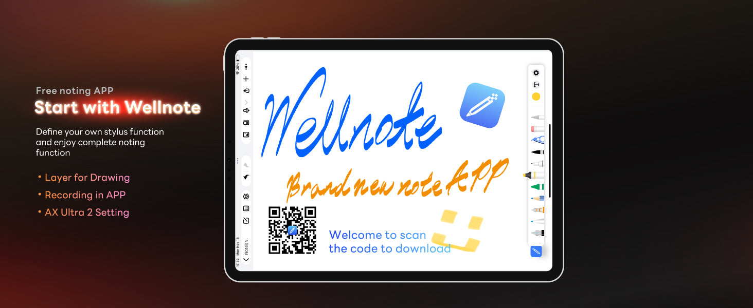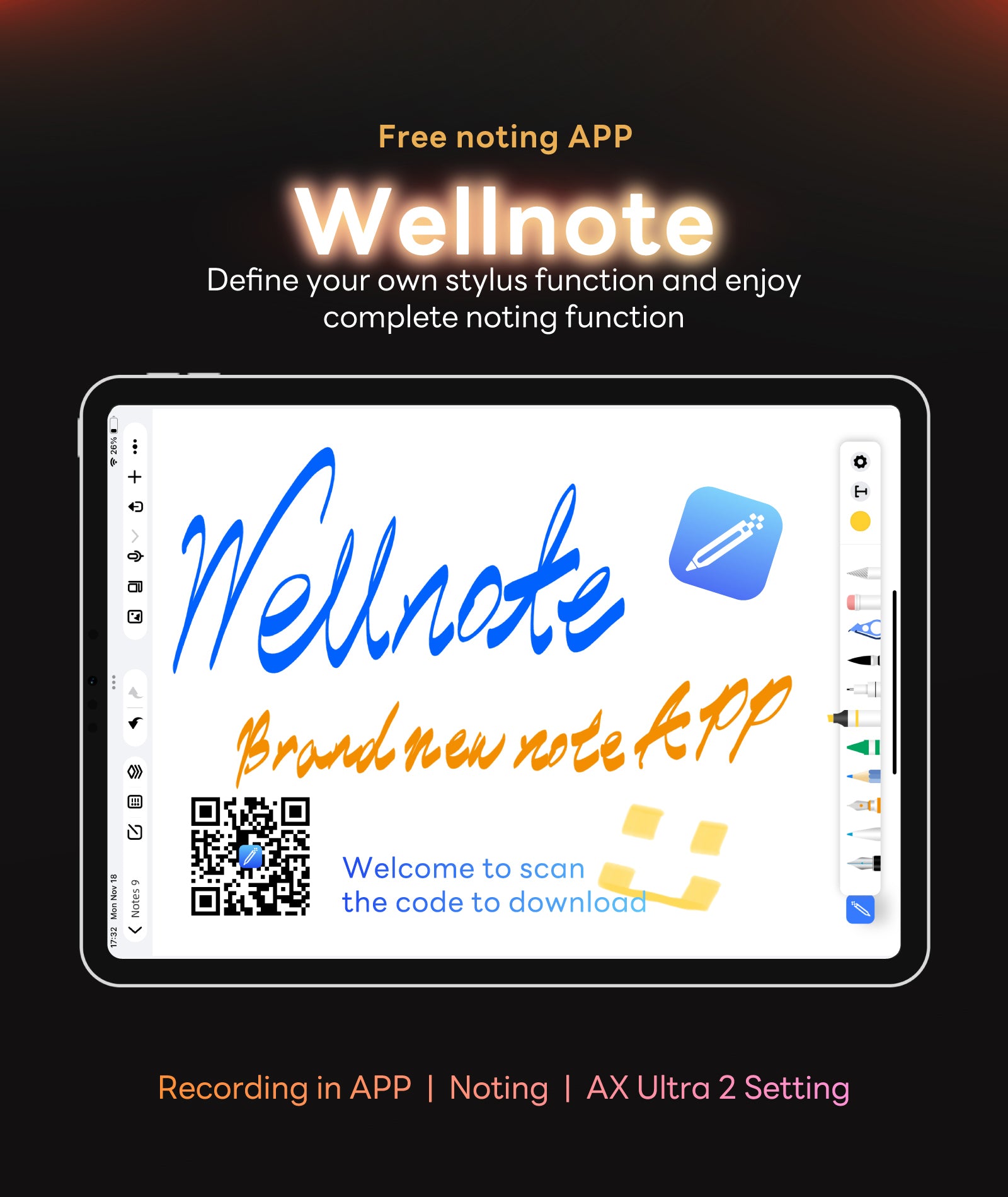 - 📲 Exclusive App “Wellnote”: Effortlessly customize the stylus functions and enjoy a free note-taking app at the same time. Features include recording within specific notes, importing PDFs for revision, and iCloud sync. Perfectly paired with our AX Ultra 2.