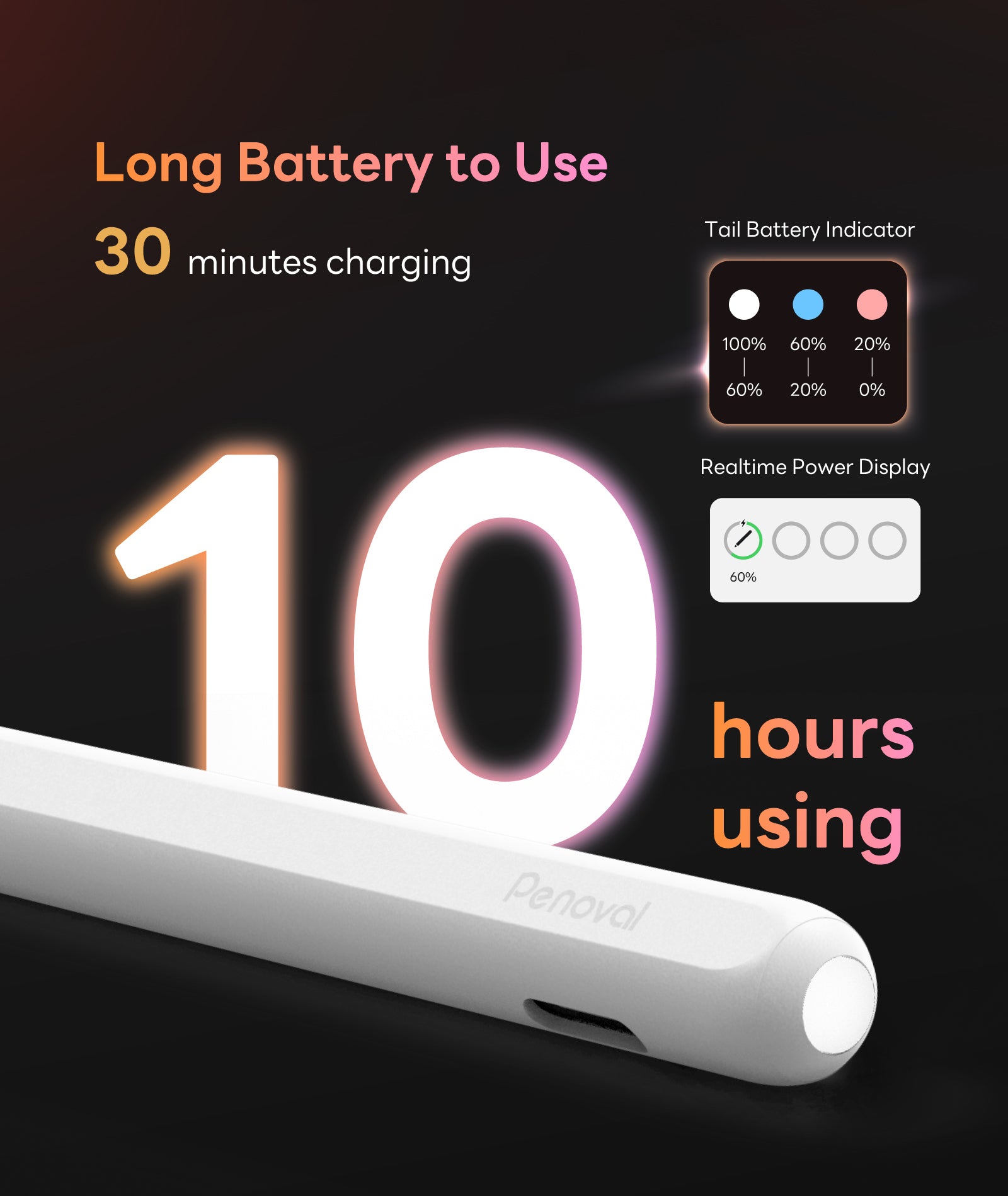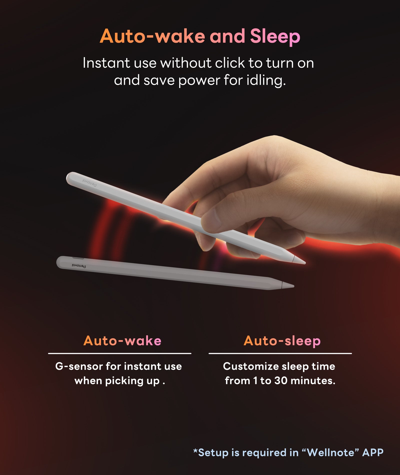 - 🔋Auto-wake and sleep : Instant use when you pick up the pen, auto sleep in 5 minutes. As a stylus developer and user, the most troublesome drawback of 3rd party stylus is “You always need to TURN ON the stylus whenever you wanna use it.”, which stops your thinking whenever you just wanna write down something immediately. Our stylus is always ready when you are, and it conserves power by sleeping after 5 minutes. ***Please download “Wellnote” APP to set up this function.