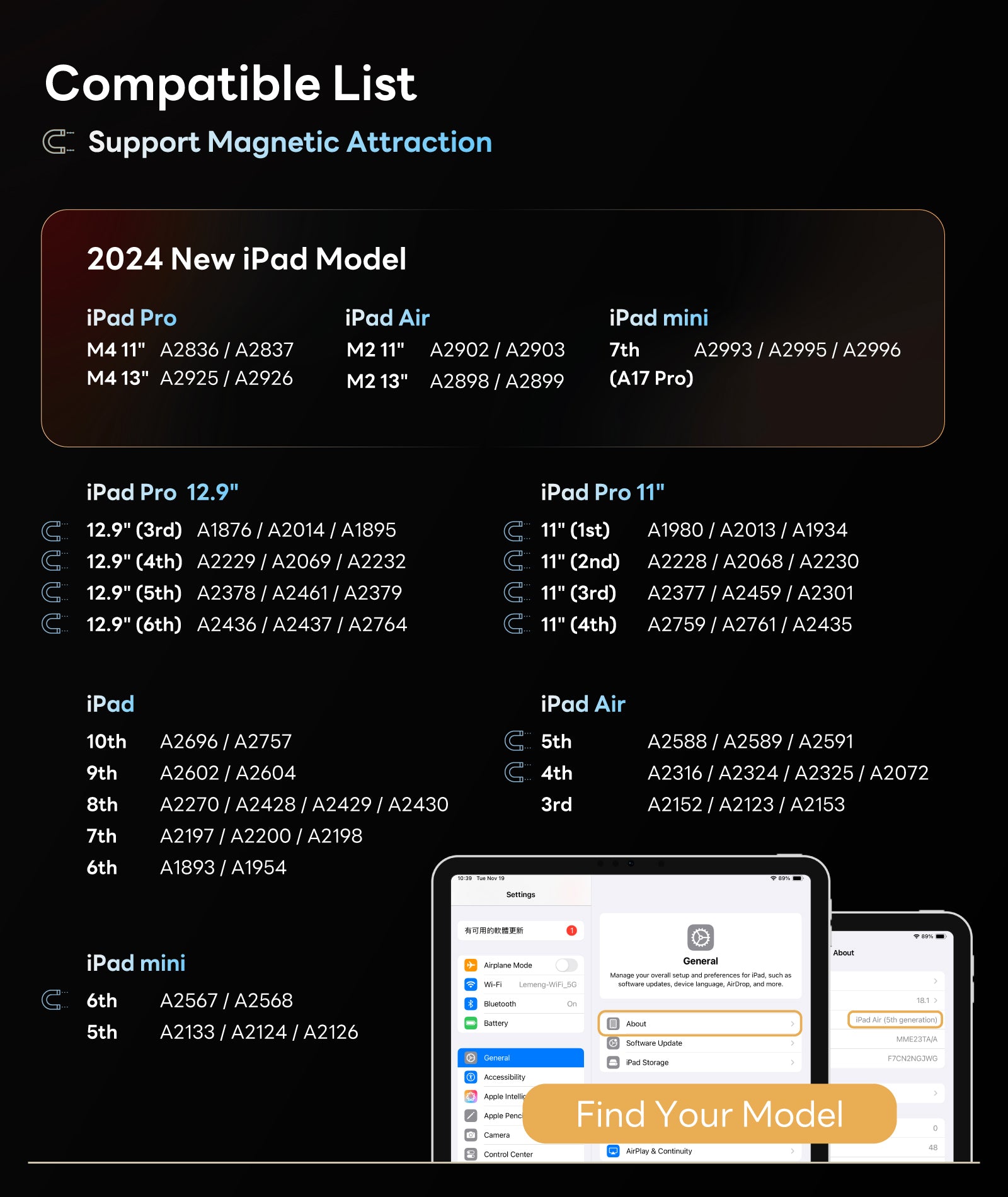 - ✅ Compatibility: Compatible with all iPads from 2018 to 2024, including iPad Pro 11" / 12.9" 3rd - 6th /13" , iPad Air M2/5/4/3 th, iPad Mini 7/6/5 th, and iPad 10/9/8/7/6 th. 🧲Magnetic attraction for Pro 11 1-4th, 12.9 3-6th, Air 4-5th, Mini 6th