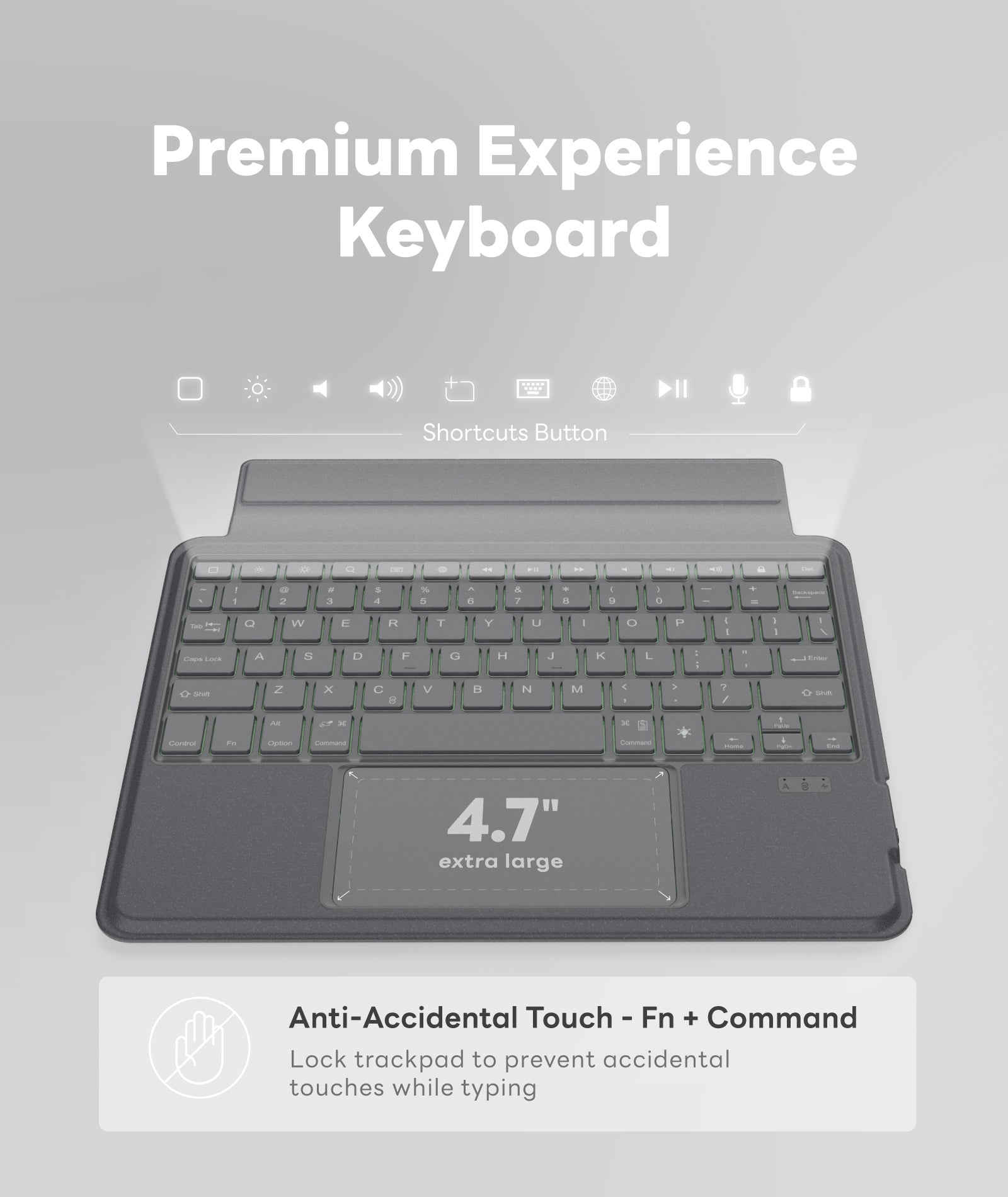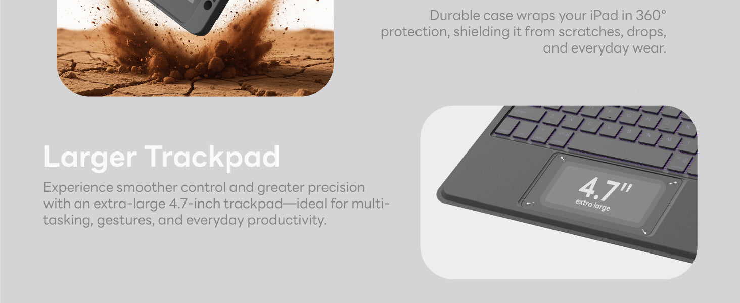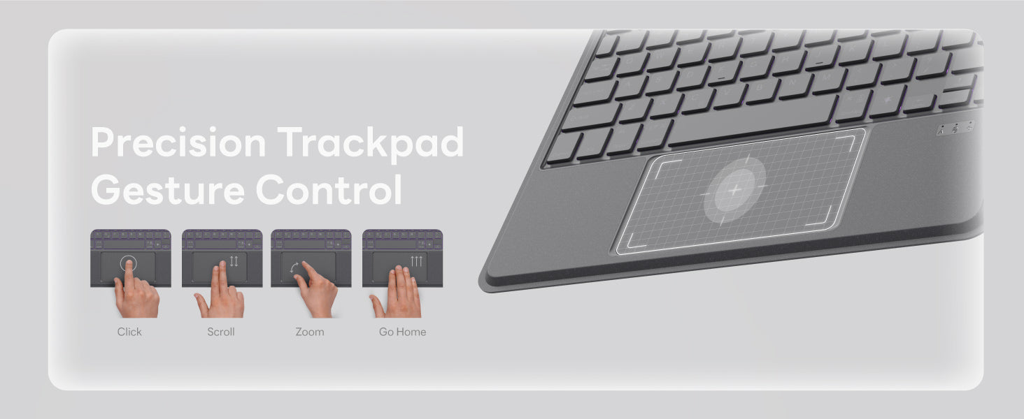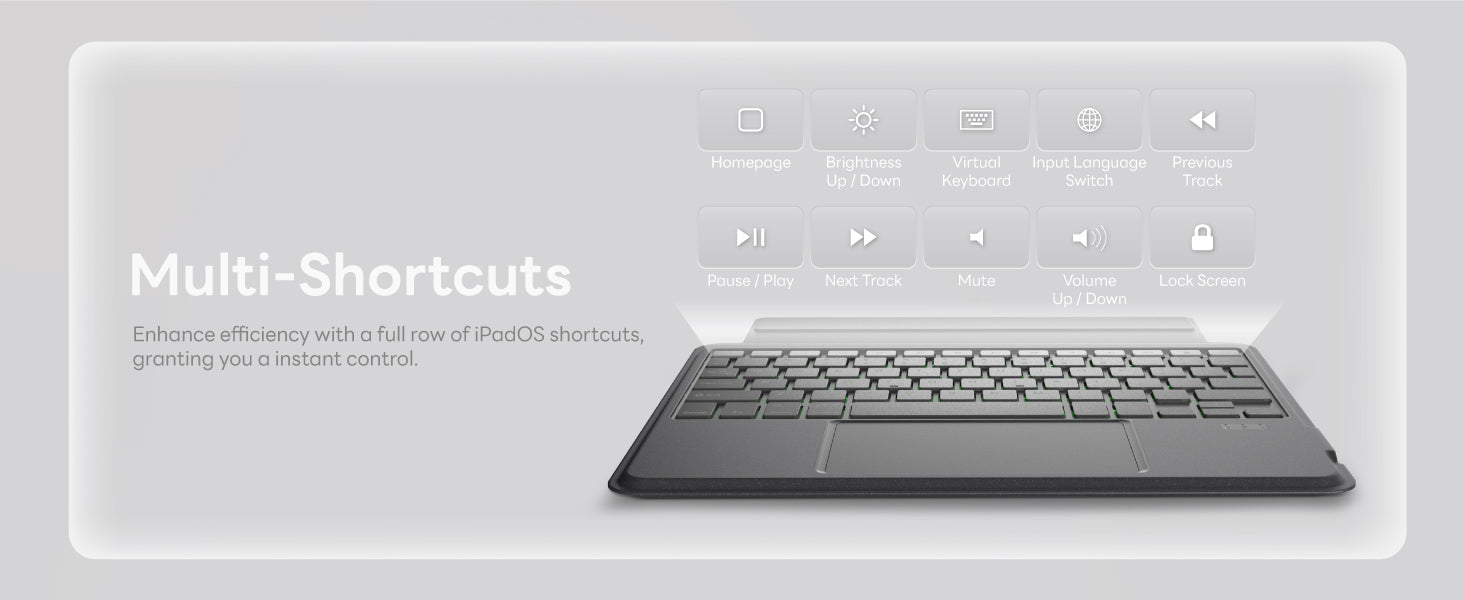 - šćMULTI-TRACKPAD & GESTURESć- Boost productivity with iPad keyboard featuring a precision trackpad and multi-touch gesture support. Utilize iPadOS gestures for easy access to your device's features and enhance your workflow. Its sleek design is perfect for on-the-go use, and with a long-lasting battery, you can work and create with ease.