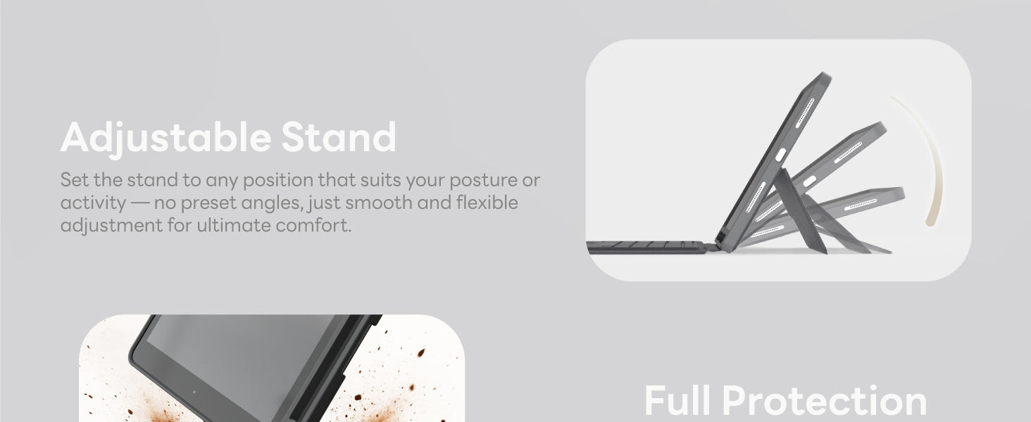 - šć135° FLIPPING STANDć- Unrestricted angles stand, adjustable from 0° to 135°. No concerns about uneven surfaces; simply find your ideal viewing angle for ultimate comfort.