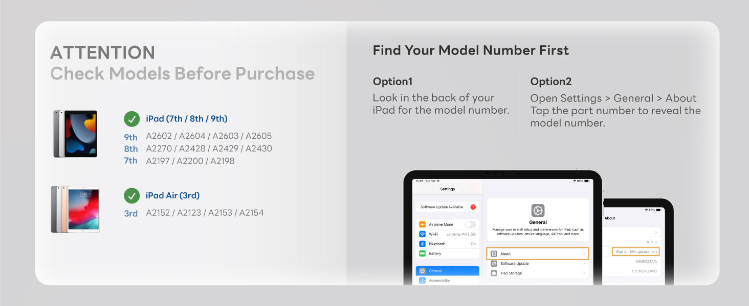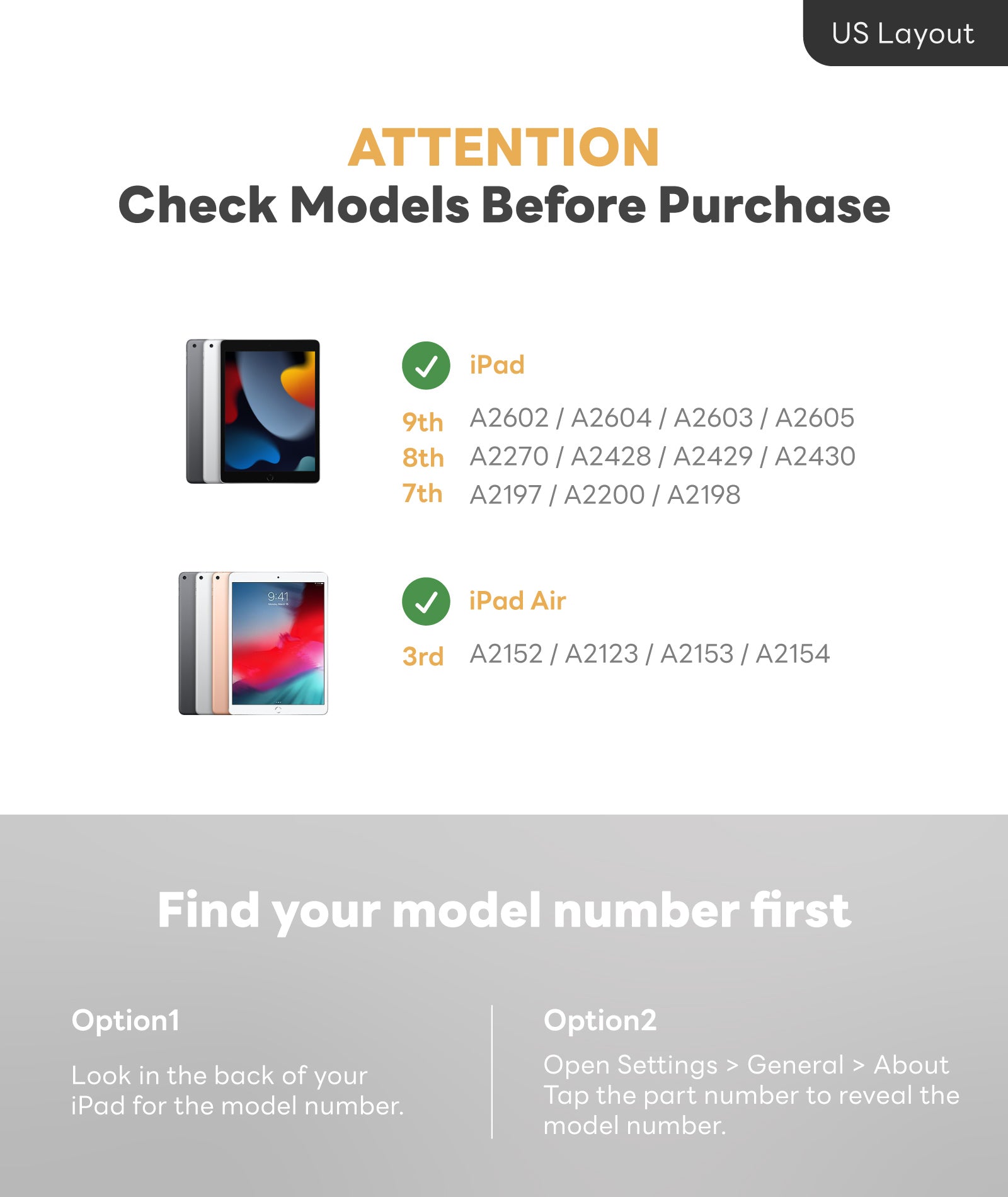 - šćCOMPATIBLE iPAD MODELSć- Apple iPad 7/8/9th 10.2", Air 3rd Generation 10.5 inch. Please confirm whether your iPad is compatible with eiP Keyboard case before you place orders. āćFind Your Modelć: Setting ā General ā About ā Model Name and number