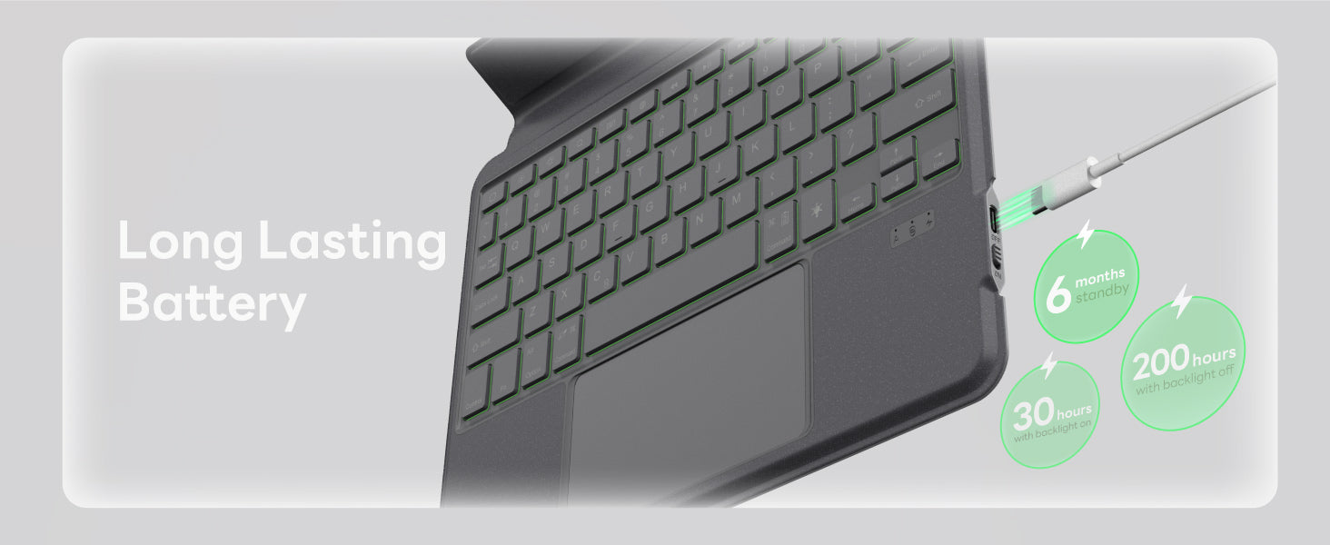 - ā”ć200HR LONGSTAND BATTERYć- eiP iPad Keyboard Case can work worry-free for up to 200 hours straight without backlight and 6 hours with backlight on. Plus, its Automatic Sleep Mode helps conserve battery power, making it even easier to stay productive.