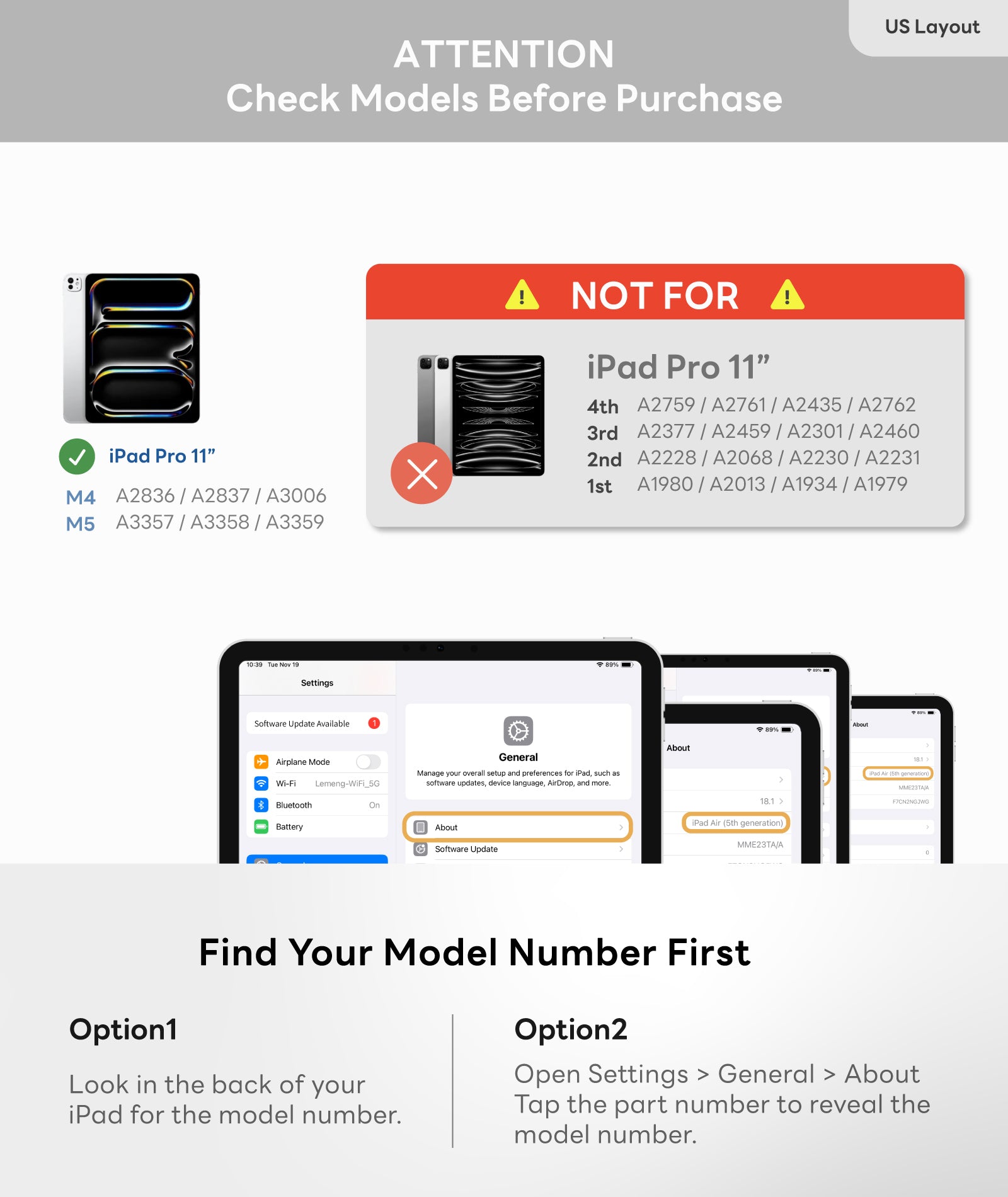 - šCompatibility - For iPad Pro 11" M5/M4 , Model Number: A3360, A3361, A3362, A2836, A2837, A3006. āćFind Your Modelć: Setting ā General ā About ā Model Name and number