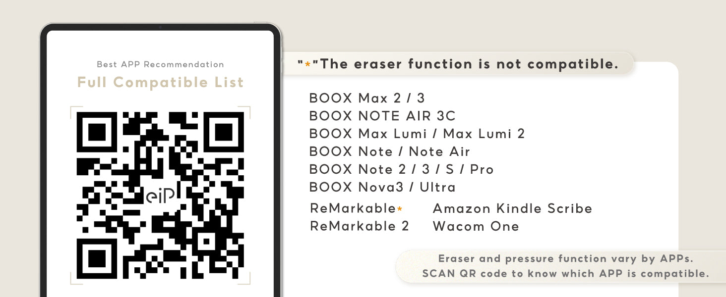 💡Compatibility: The eiP EMR Stylus Pen utilizes EMR Technology and is compatible with the Remarkable 2 Tablet, Kindle Scribe, Boox Tablet, Samsung Galaxy Tab S7/S8/S9, and more devices listed. ⚠️Please check the comprehensive compatibility chart before making a purchase. ❗Not compatible with Apple devices.