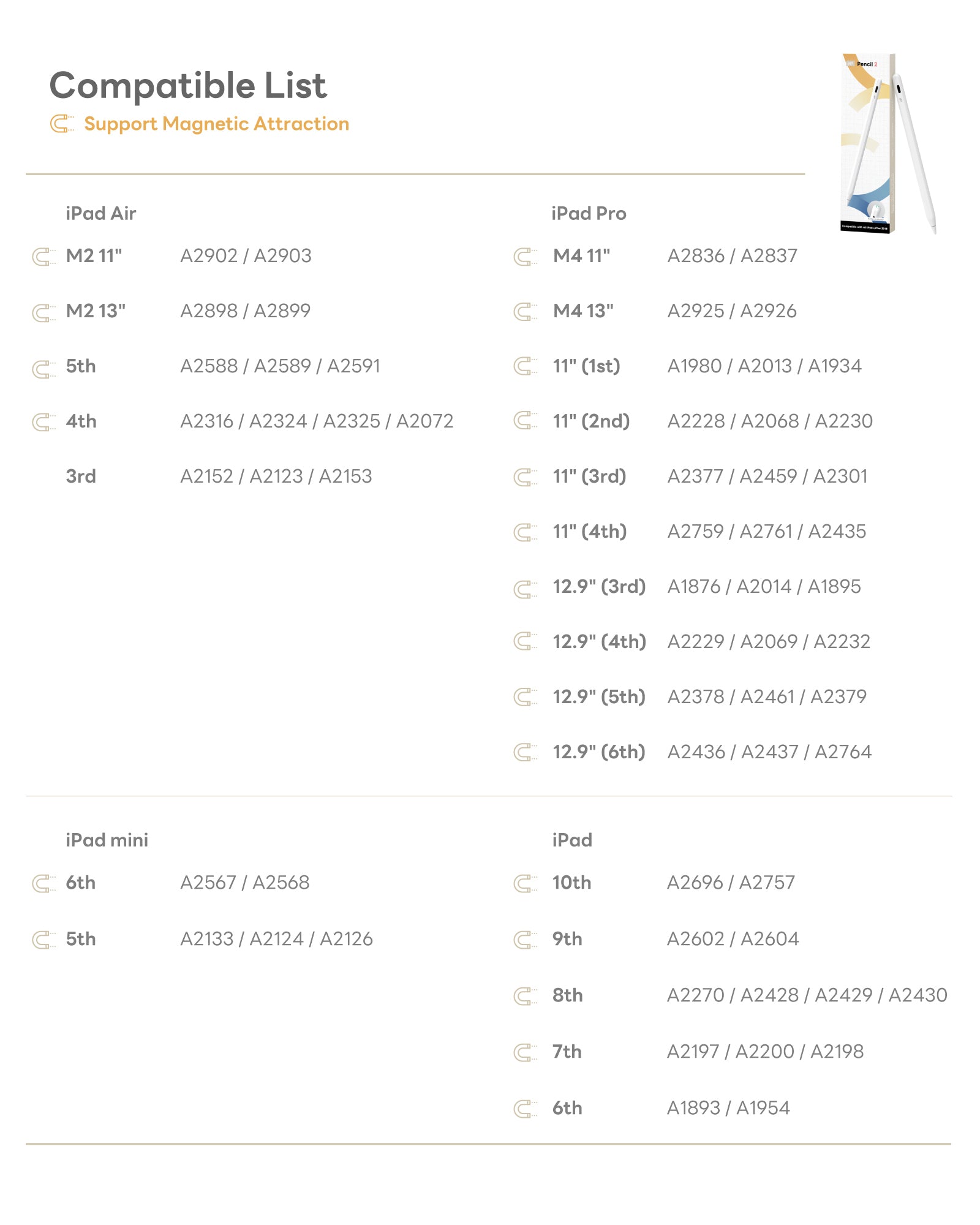 🧲Model : iPad Pro 11/12.9/13-inch M4, iPad Air 4/5/M2, iPad Mini 5-6th, iPad 6-10th.