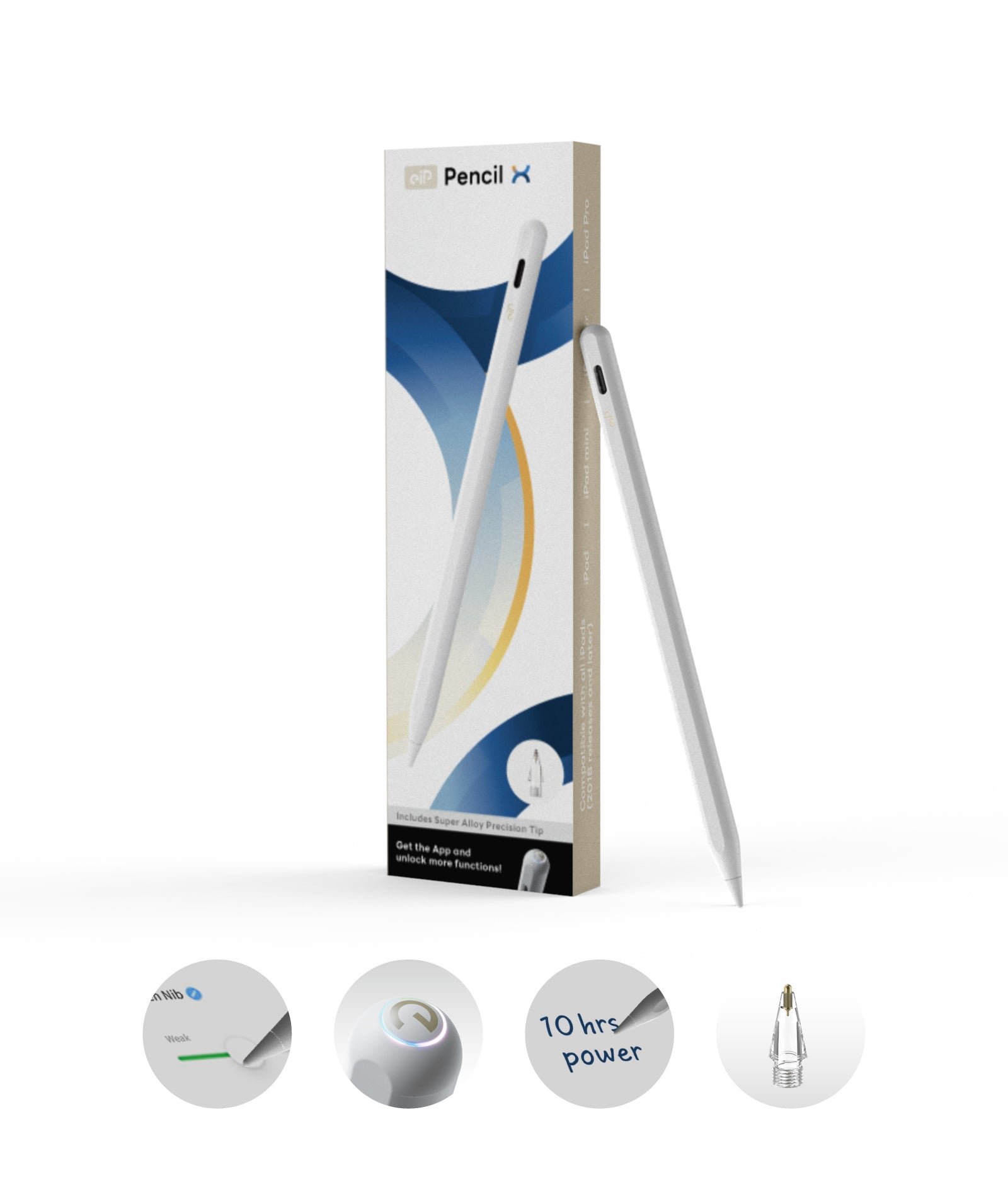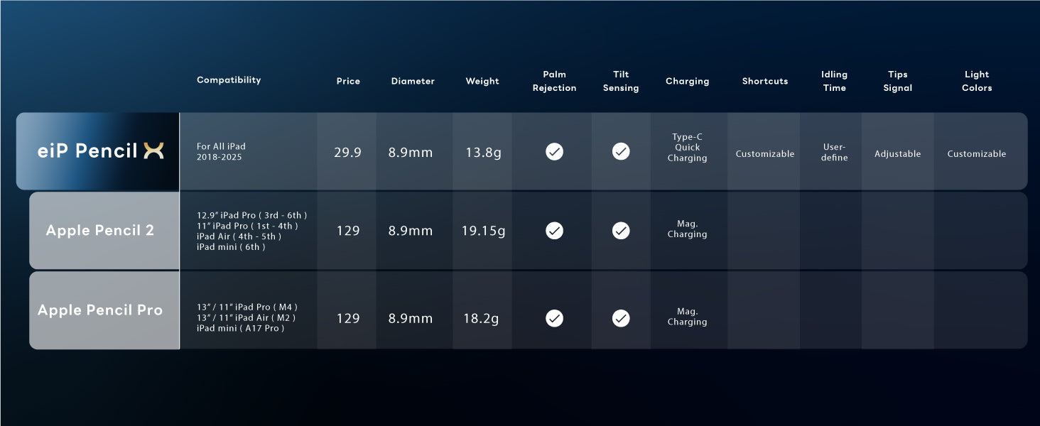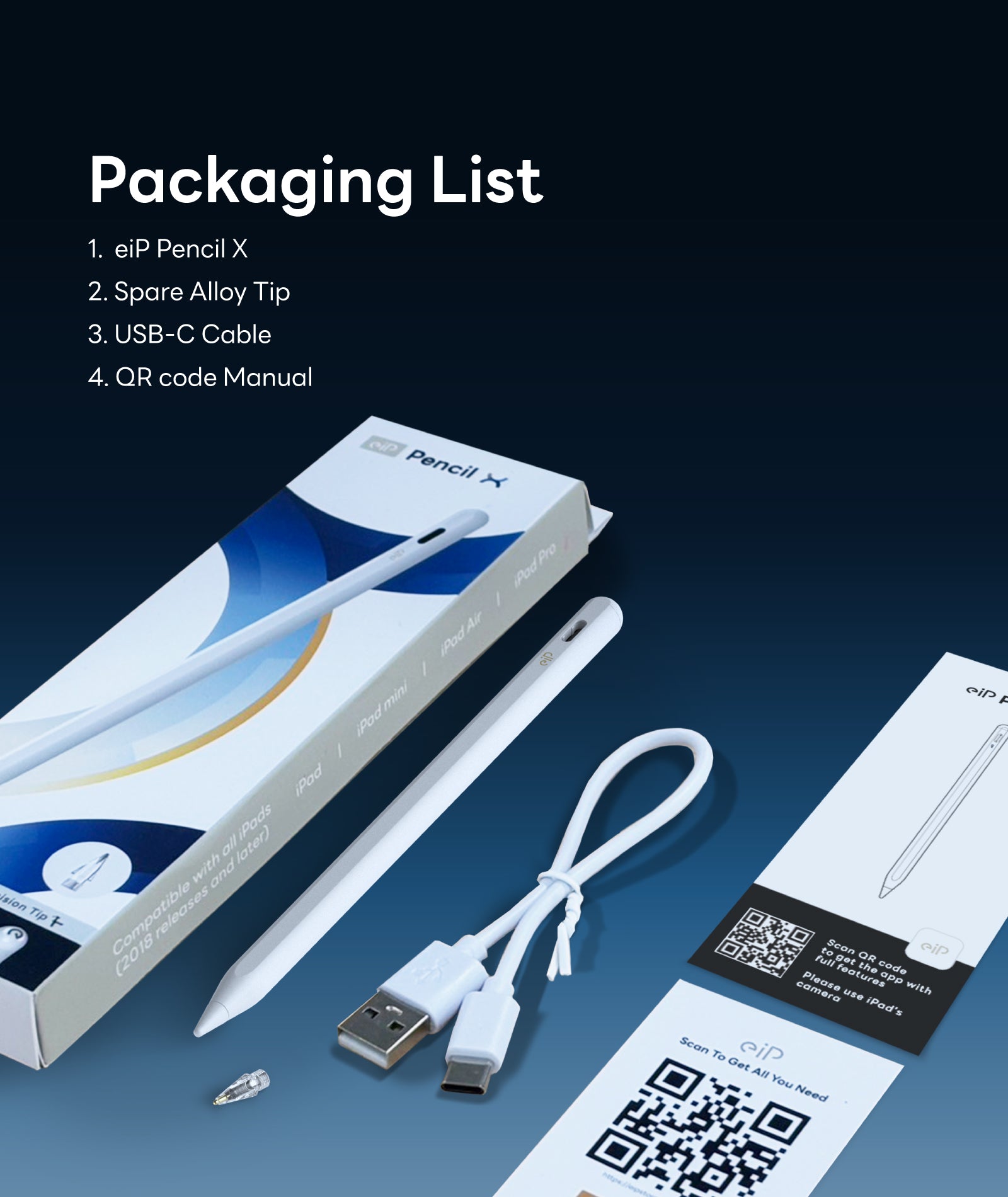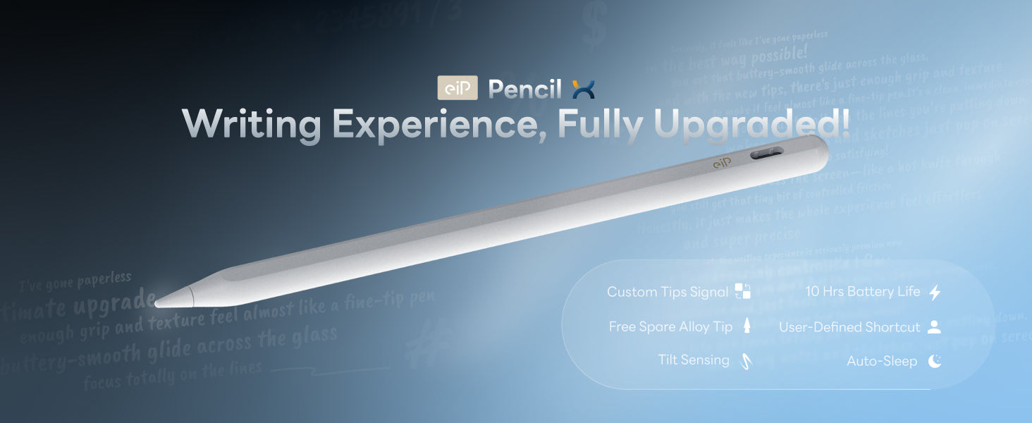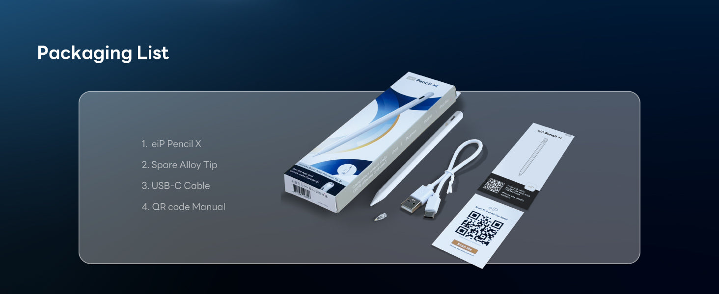 - 📦What's in the Box?: Includes eiP Pencil X, spare alloy tip x1, type-c cable, and manual.