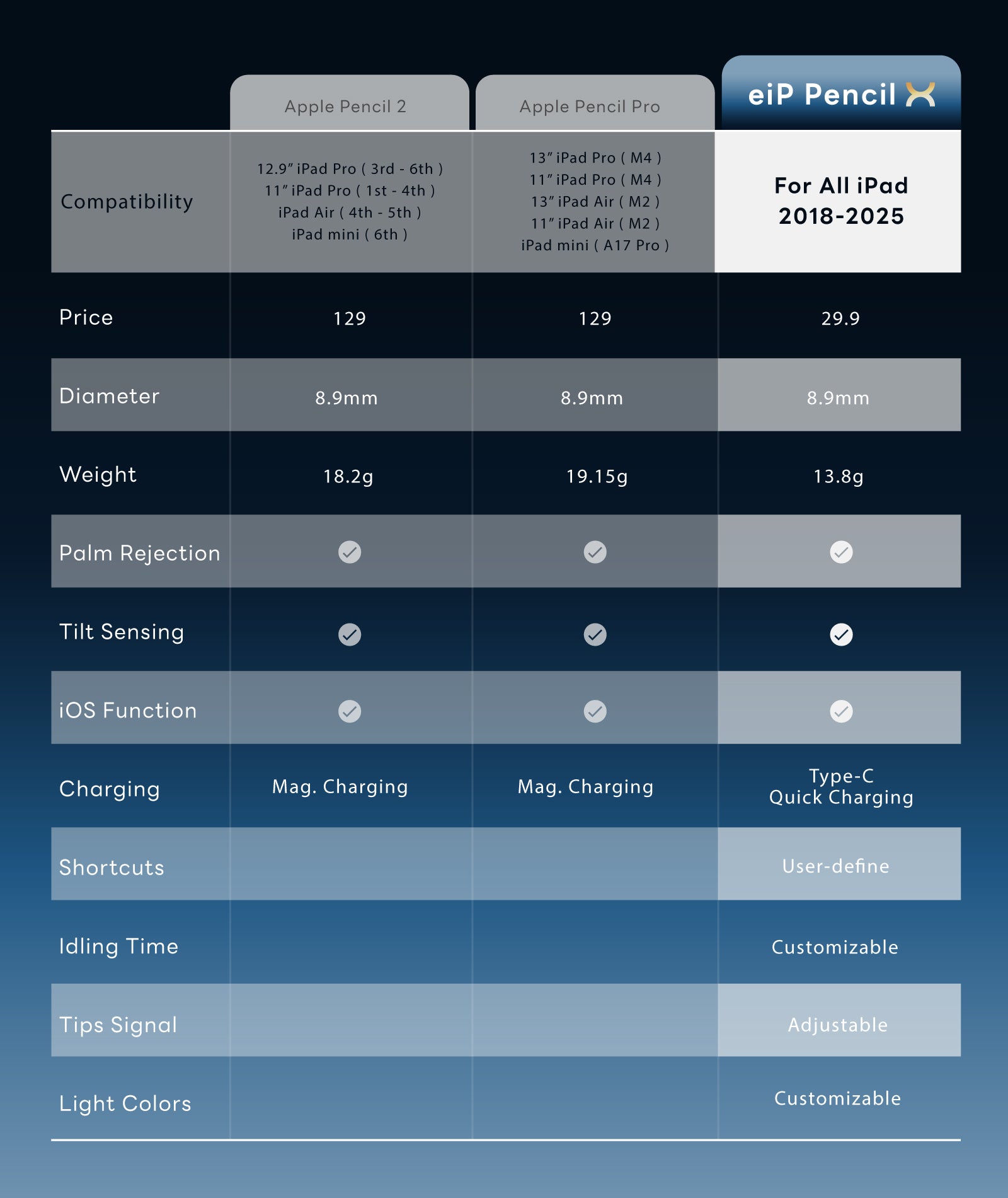 - 👌Compatibility : It's compatible with all iPad Model between 2018 - 2025. For more detail, please check our compatibility chart. ⚠️Please unpair your Apple Pencil before using our stylus if you have paired with iPencil before.