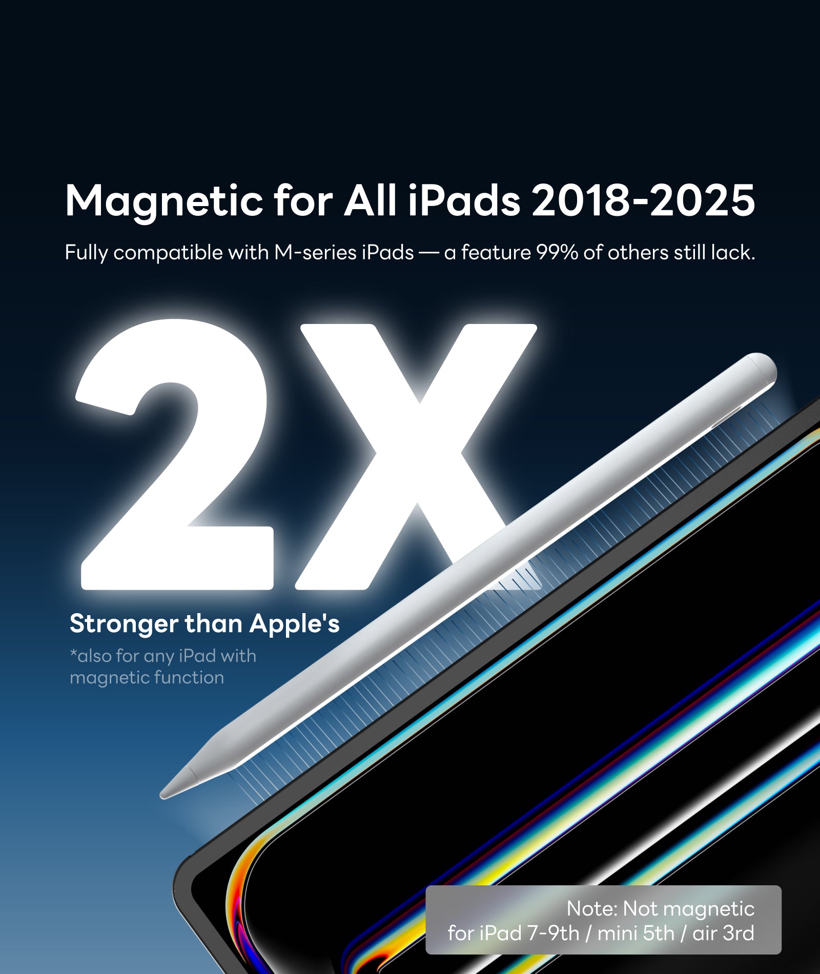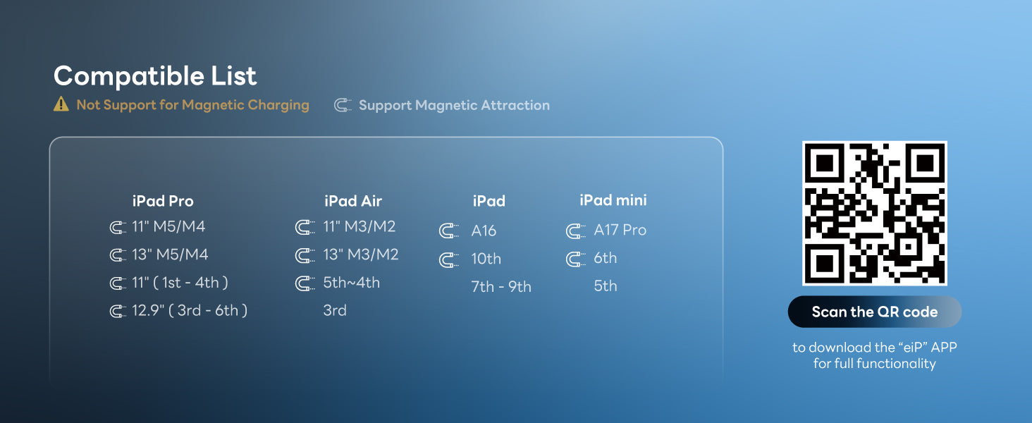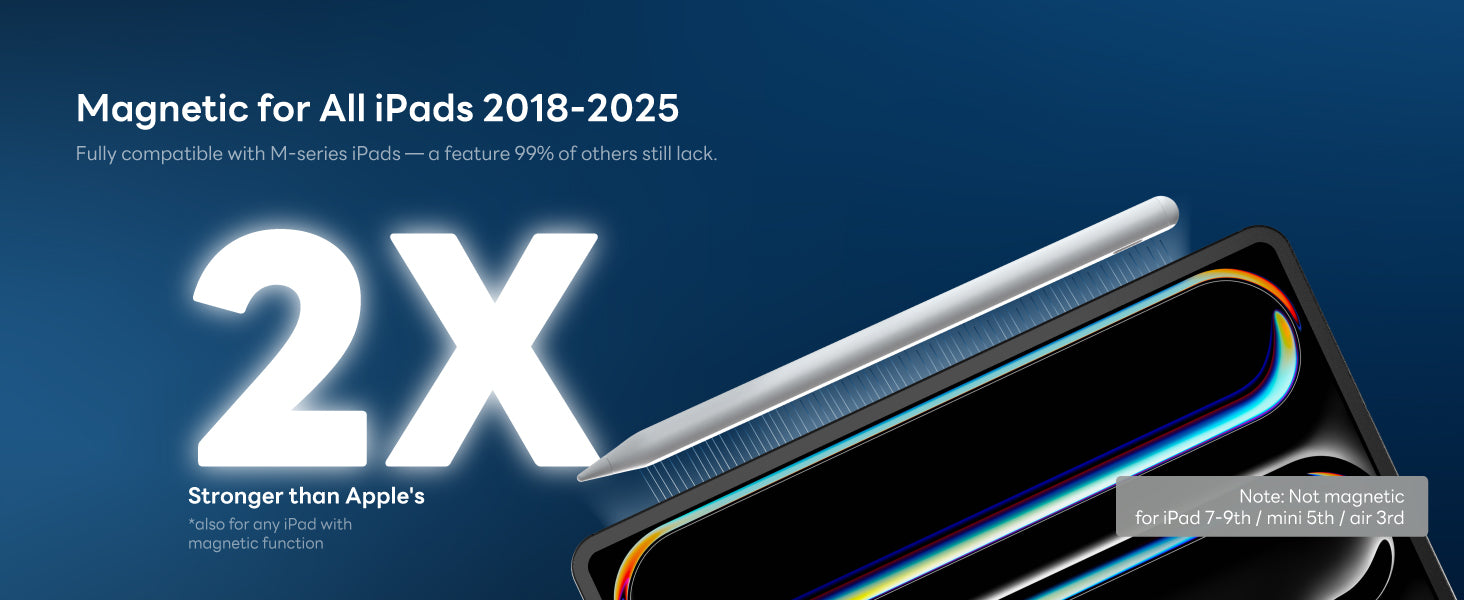 - ✅Exclusive Full Magnetic Design(NOT support Magnetic charging):In response to the updated magnet array of the 2024 iPad, we have optimized the magnet distribution to ensure compatibility with all magnetically attachable iPads from 2018 to 2025. 🧲Model : iPad Pro 11/12.9/13-inch M4/M5, iPad Air 4/5/M2/M3, iPad Mini 6/7th, iPad A16 11/10th.