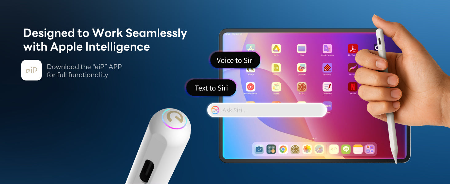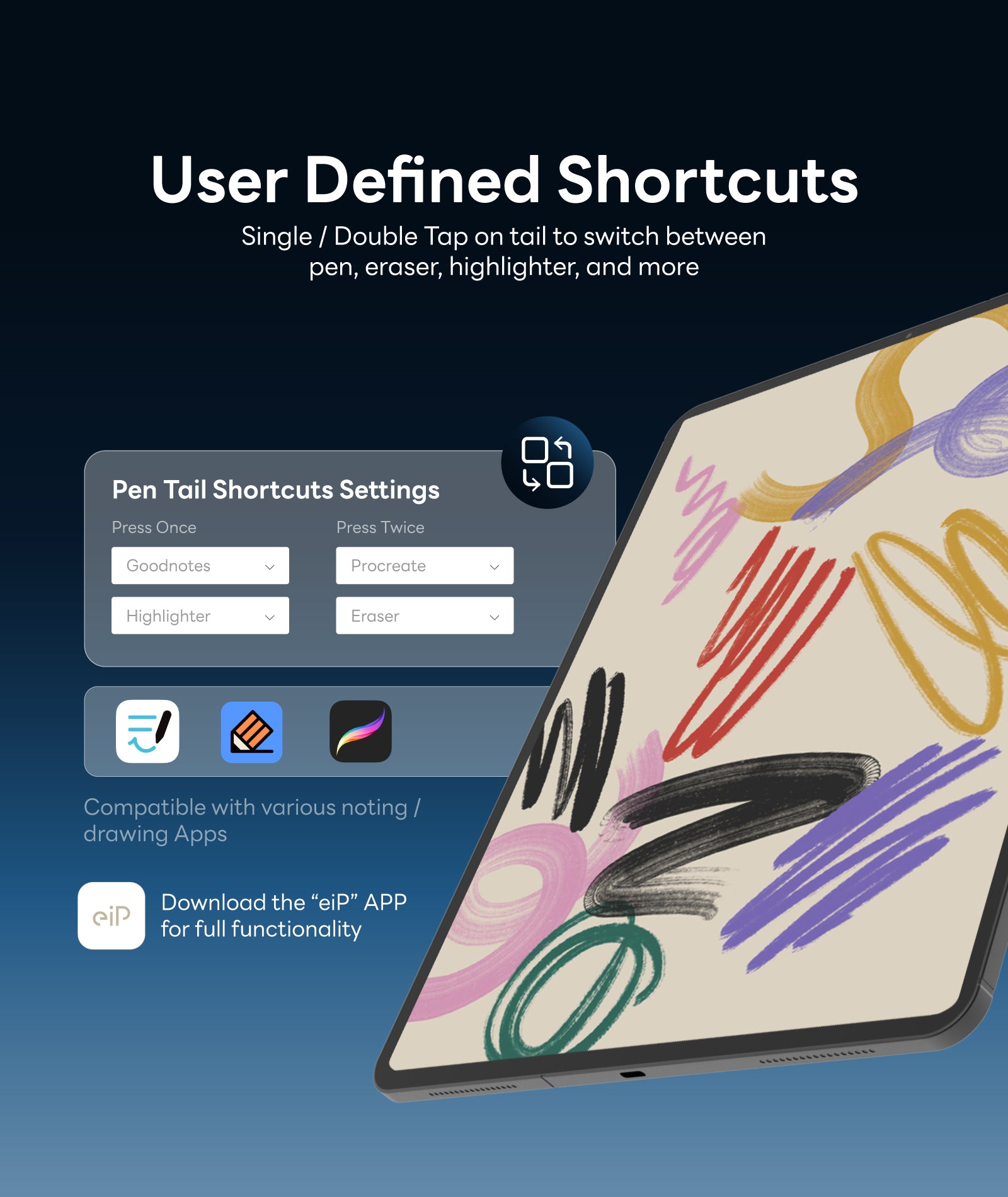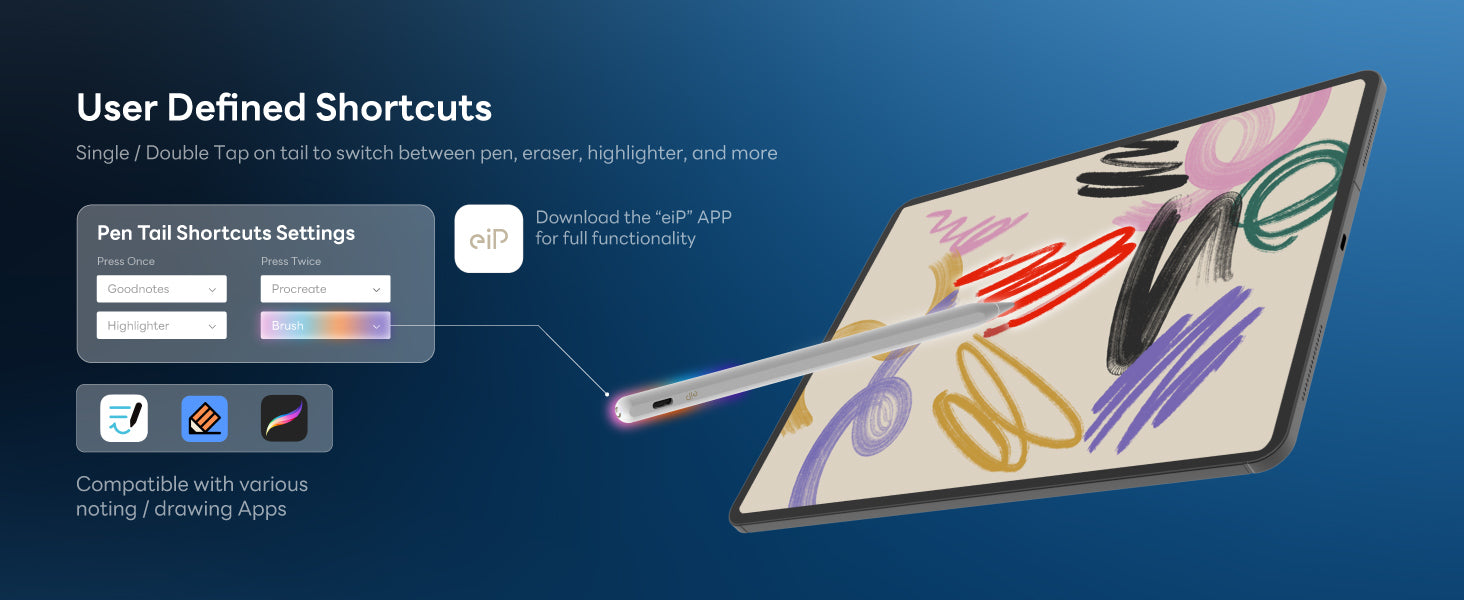 - ✍️Customize shortcut with "eiP" APP : Single/double tap on tail to tool switch, Eraser, Screenshot, Home, etc. You can also customize the tail-ring color for your style.