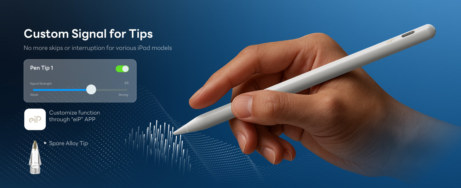 - 📶 Custom Signal: Stylus signal is essential for stable writing. Different iPad models—Pro, Air, Mini—have varying signal requirements, which can sometimes cause skips or interruptions with other styluses. With our “eiP” app, you can customize the tip's signal. Most users won’t even need to adjust it, but it’s there if you do!
