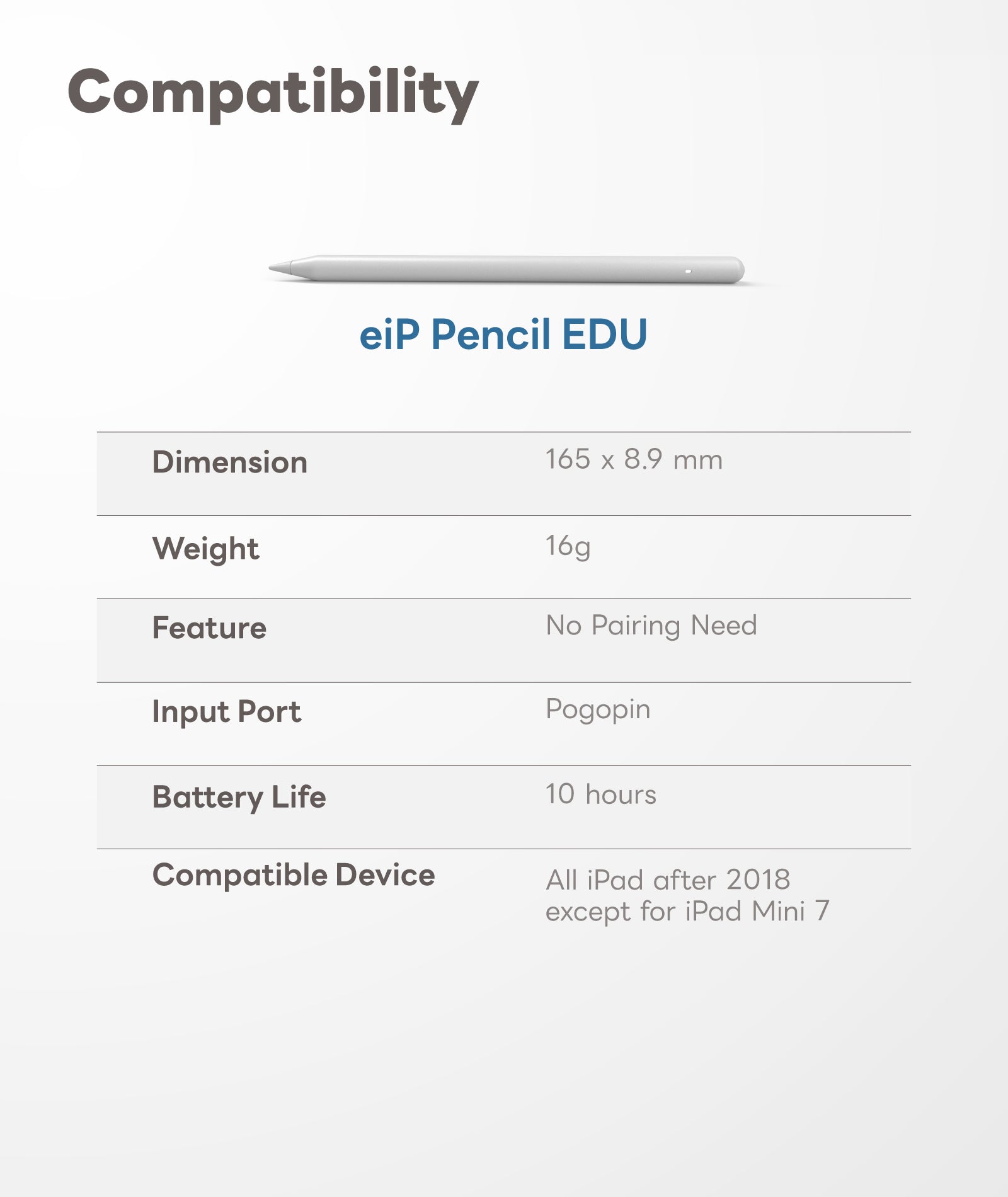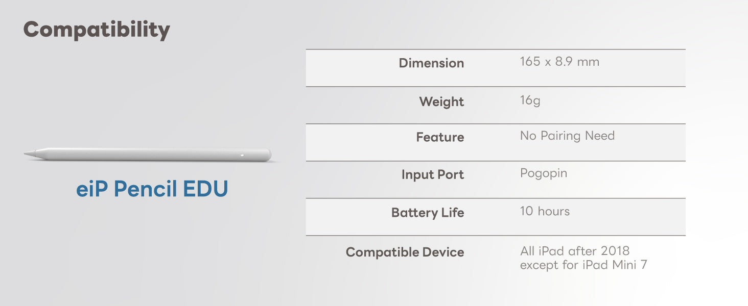- Wide Compatibility – Supports the eiP EDU Pencil for iPad. It features magnetic charging via pogo pins. Note: Styluses are sold seperately.