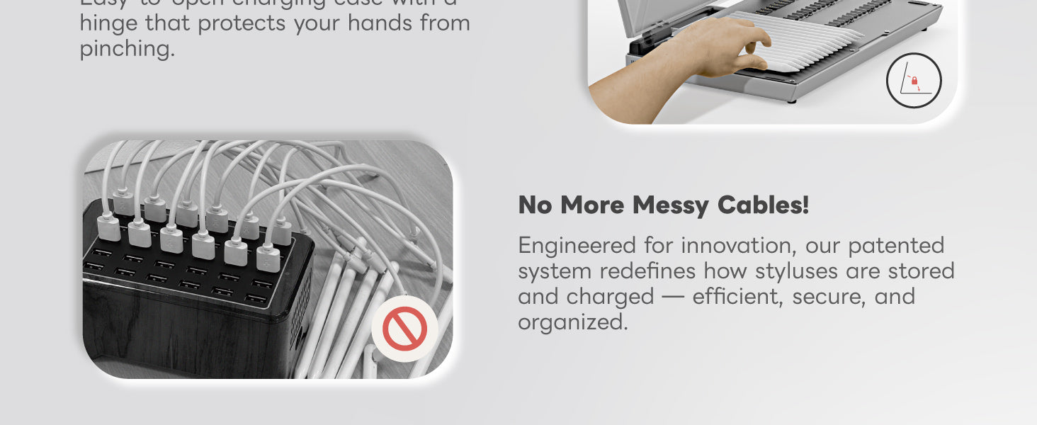 - 30-Slot Charging Capacity – Charge up to 30 styluses simultaneously, making it perfect for schools, classrooms, offices, and shared environments.