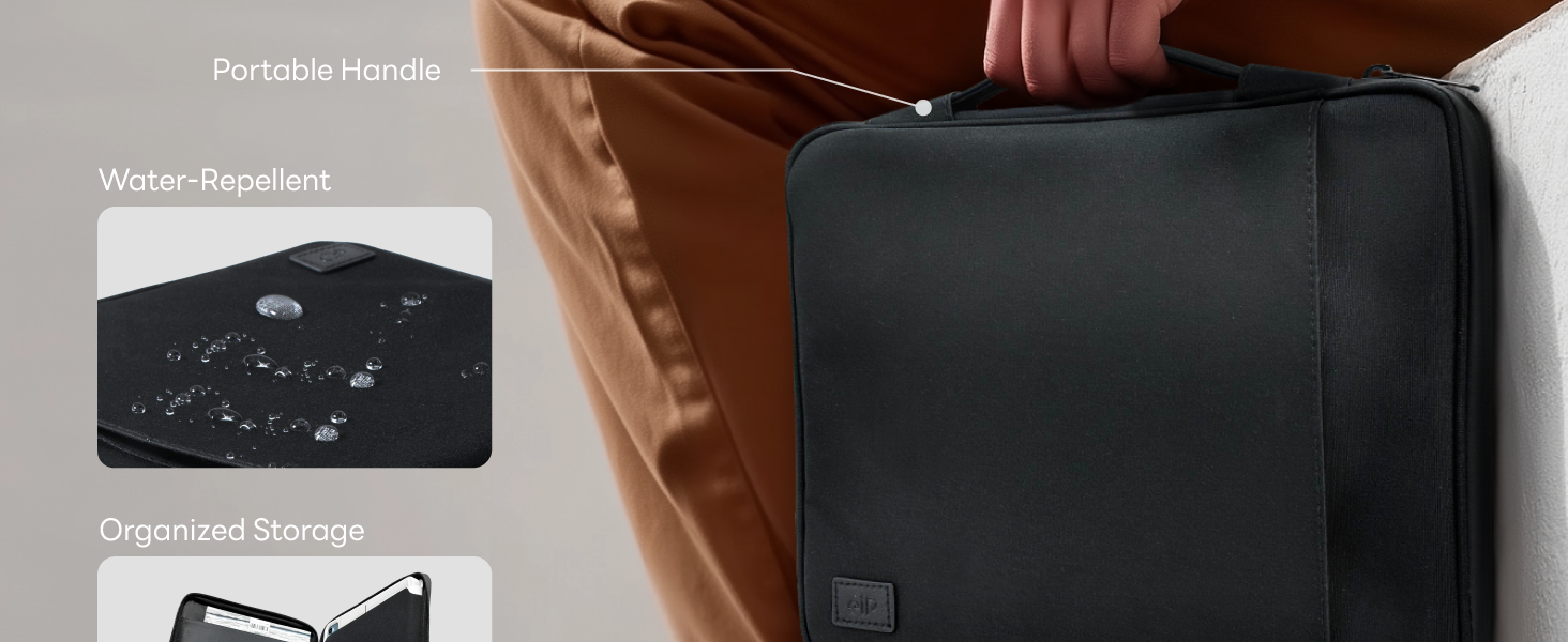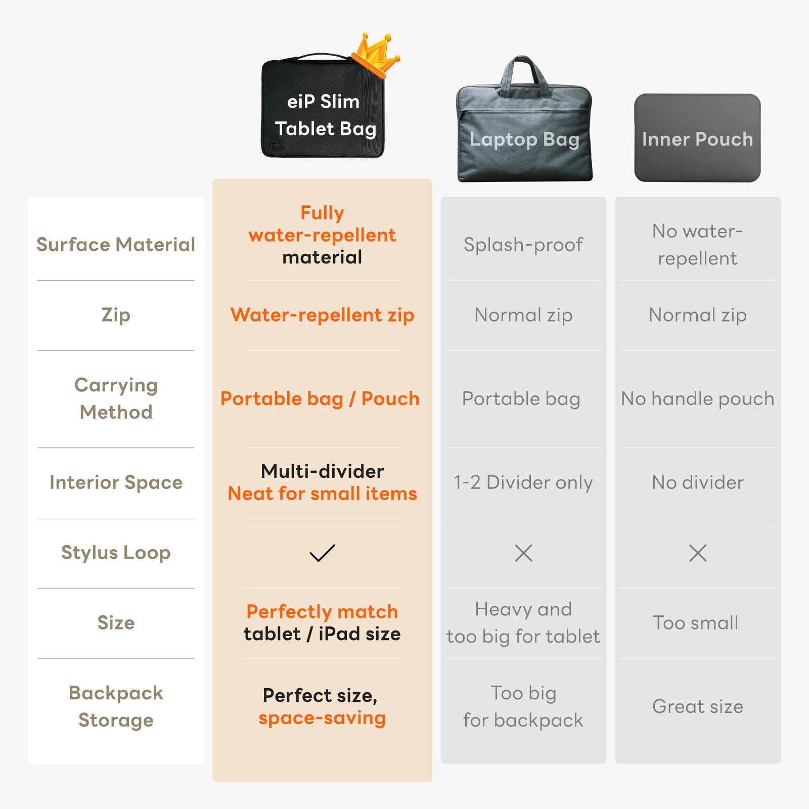 The eiP Slim Sleeve Tablet Bag is made with water-repellent material and designed to perfectly fit your tablet. It features dedicated compartments for styluses, keyboards, charging cables, and mice.