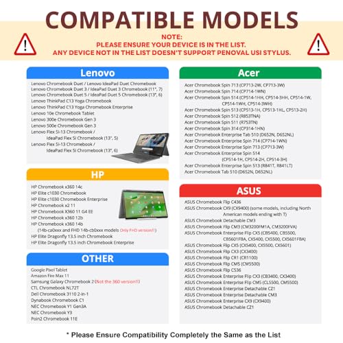 ✅ WIDELY COMPATIBLE - The Penoval USI pen is compatible with Lenovo Chromebook Duet, ASUS Chromebook C436, HP Chromebook X360, Acer Spin 713 and all other Chromebooks which support USI protocol. ***Please check your devices before placing an order, a list of compatible devices is shown in the product images. Please contact us if you have questions about product compatibility. ***Note: NOT compatible with Lenovo Chromebook Duet 3